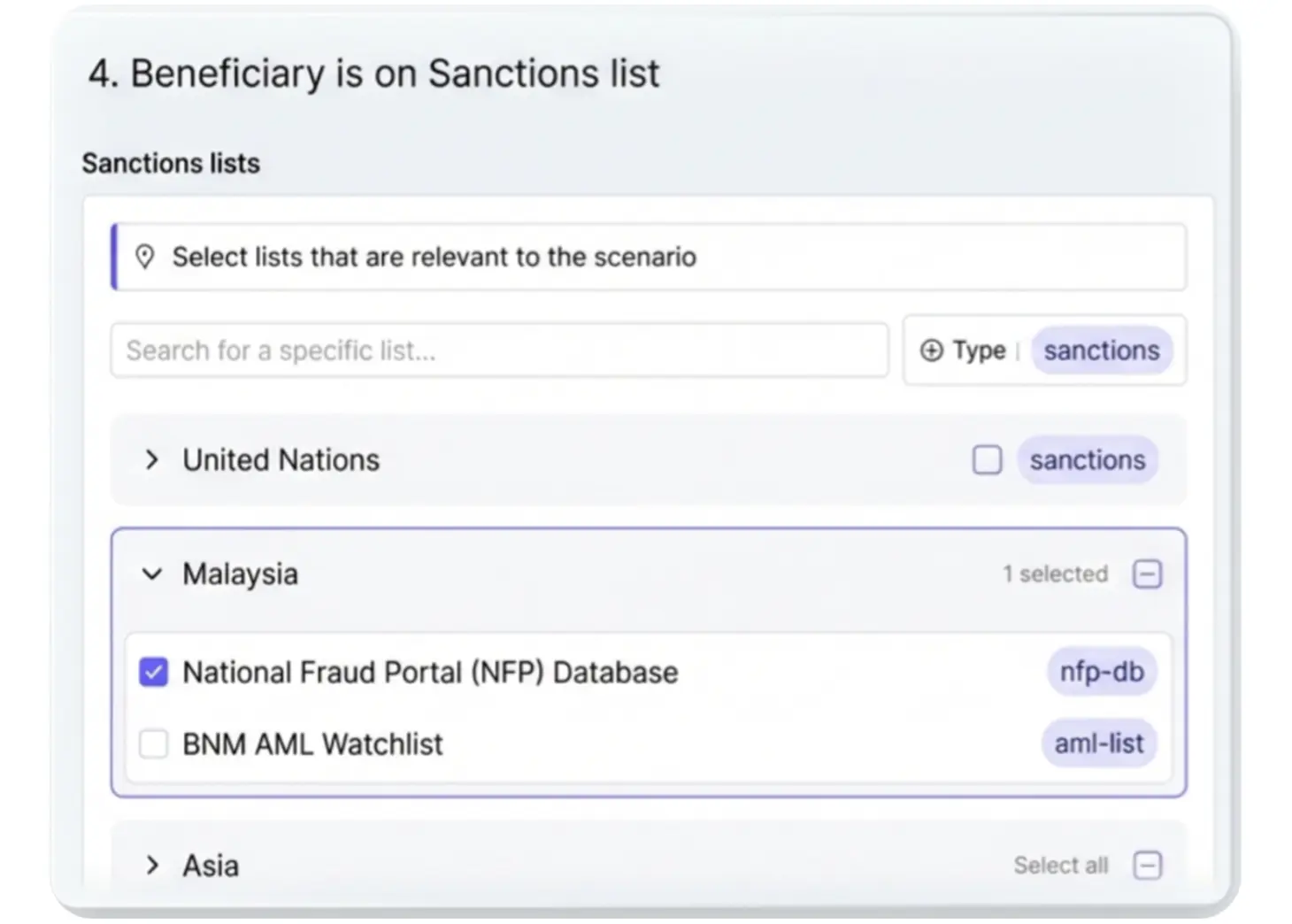 Automated sanction screening with customisable, AI-driven scenario-based rule management for evolving compliance needs.